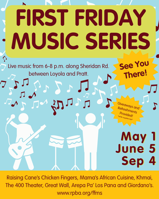 Join us for the First Friday Music Series, an evening of live music that will take place on Sheridan Rd. between Devon and Pratt. Enjoy performances on Sister Jean Plaza by the Loyola Red Line station and outdoor patios at Raising Cane’s Chicken Fingers, Mama’s African Cuisine, Khmai, The 400 Theater, Great Wall, Arepa Pa’ Los Pana and Giordano’s.